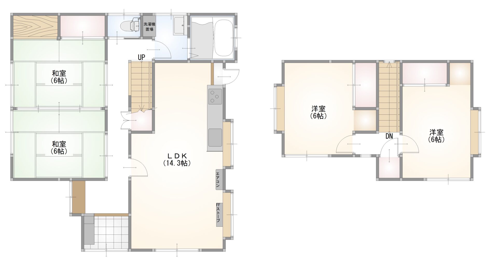 (1階:LDK14.3帖・和室6帖・和室6帖/2階:洋室6帖・洋室6帖)